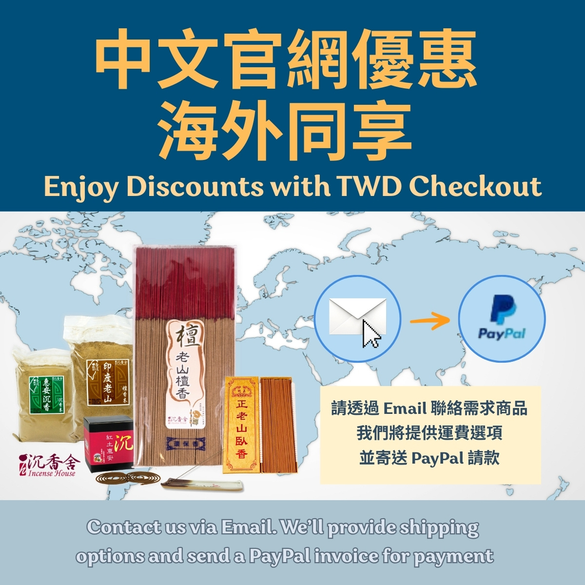 Contact us by Email ( info@incensehouse.com.tw ) with your order request.