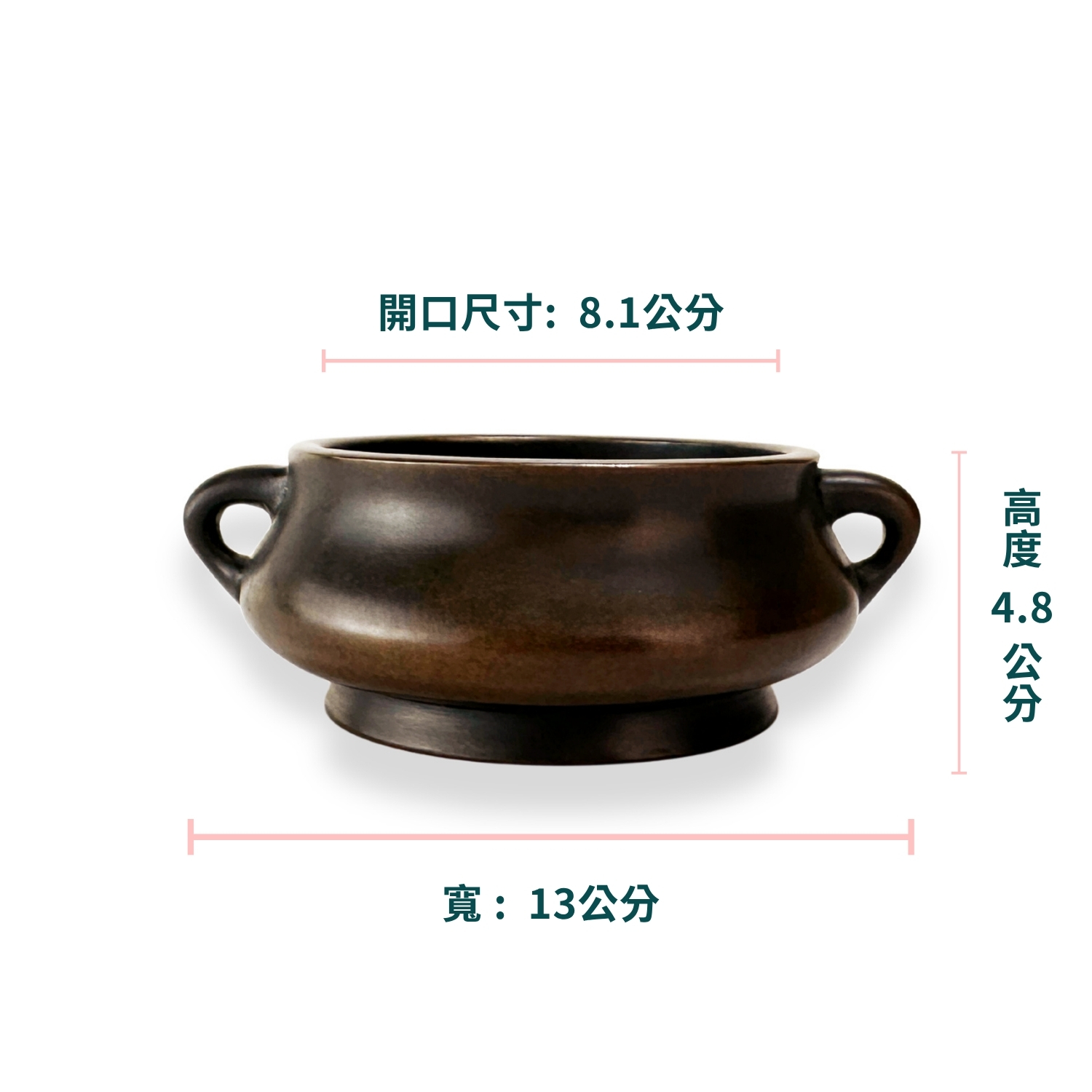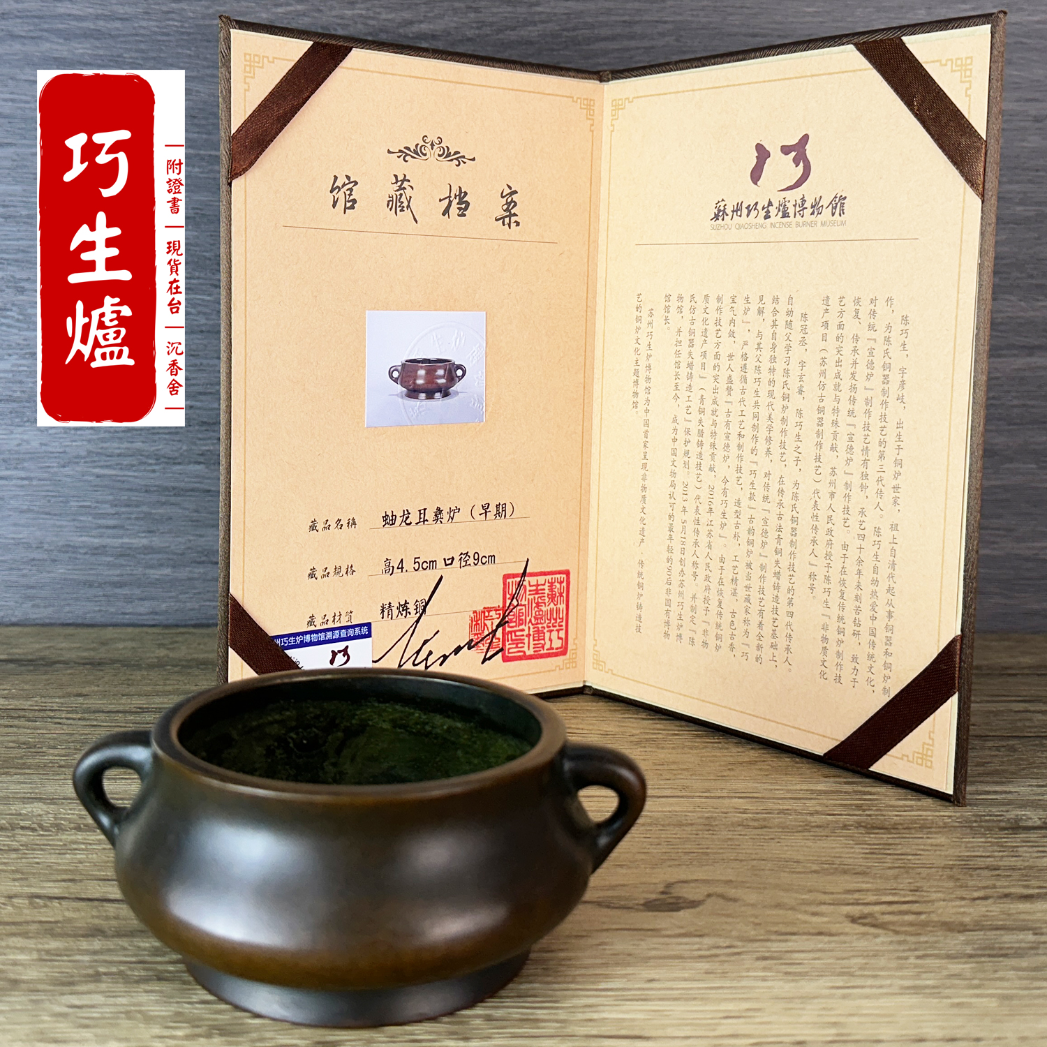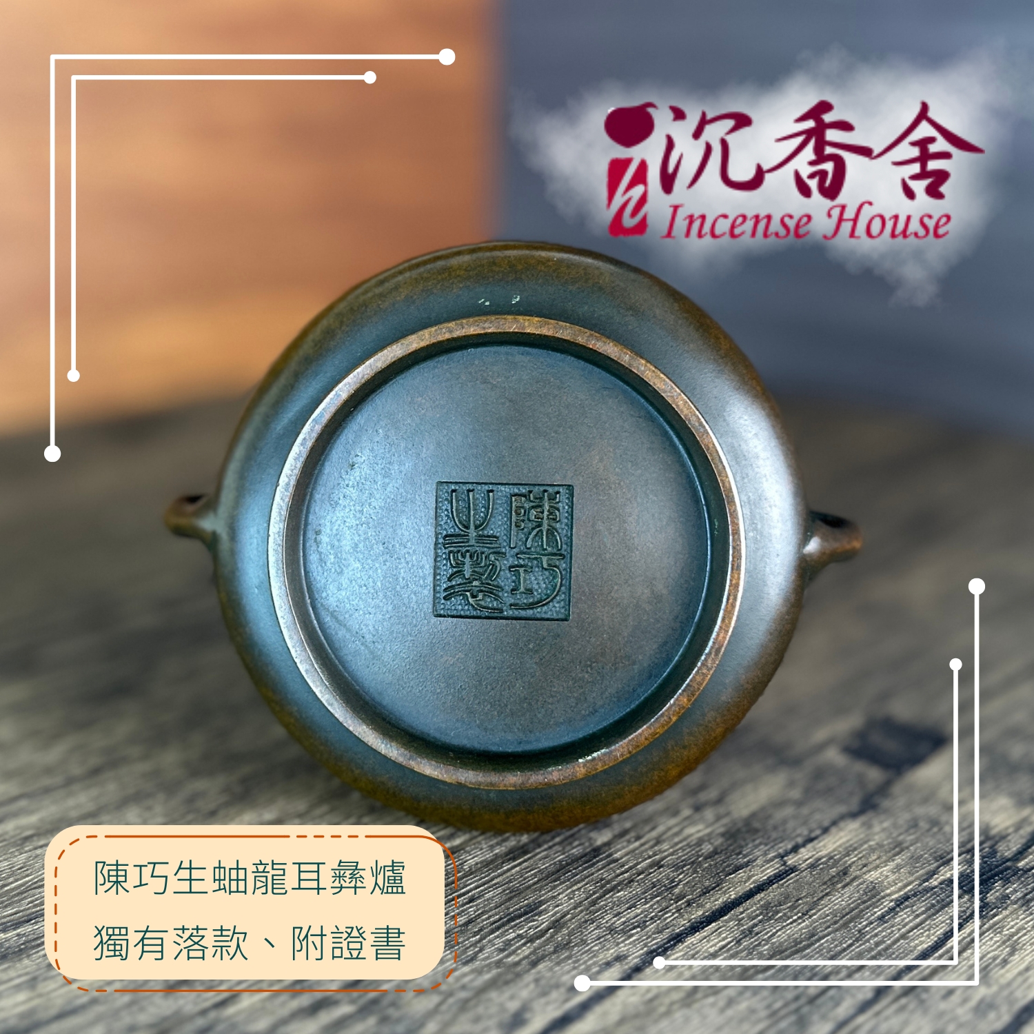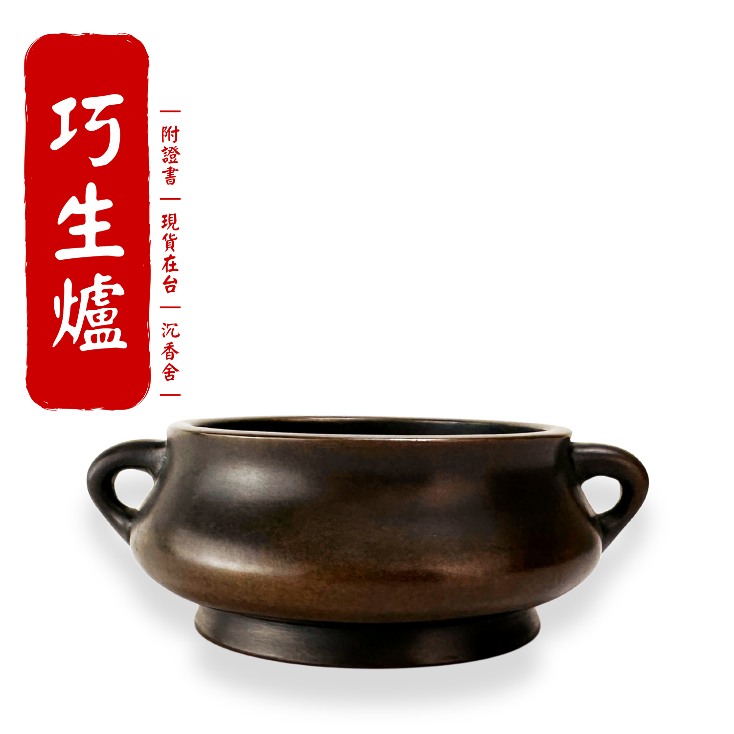 由中國銅爐匠人 陳巧生 手工鑄造,採蚰龍耳(蜒蚰耳)經典彝式器型。爐身圓潤飽滿、圈足穩重,仿古與作銹工藝細膩自然,色澤內斂沉穩,隨使用養成更顯光澤。