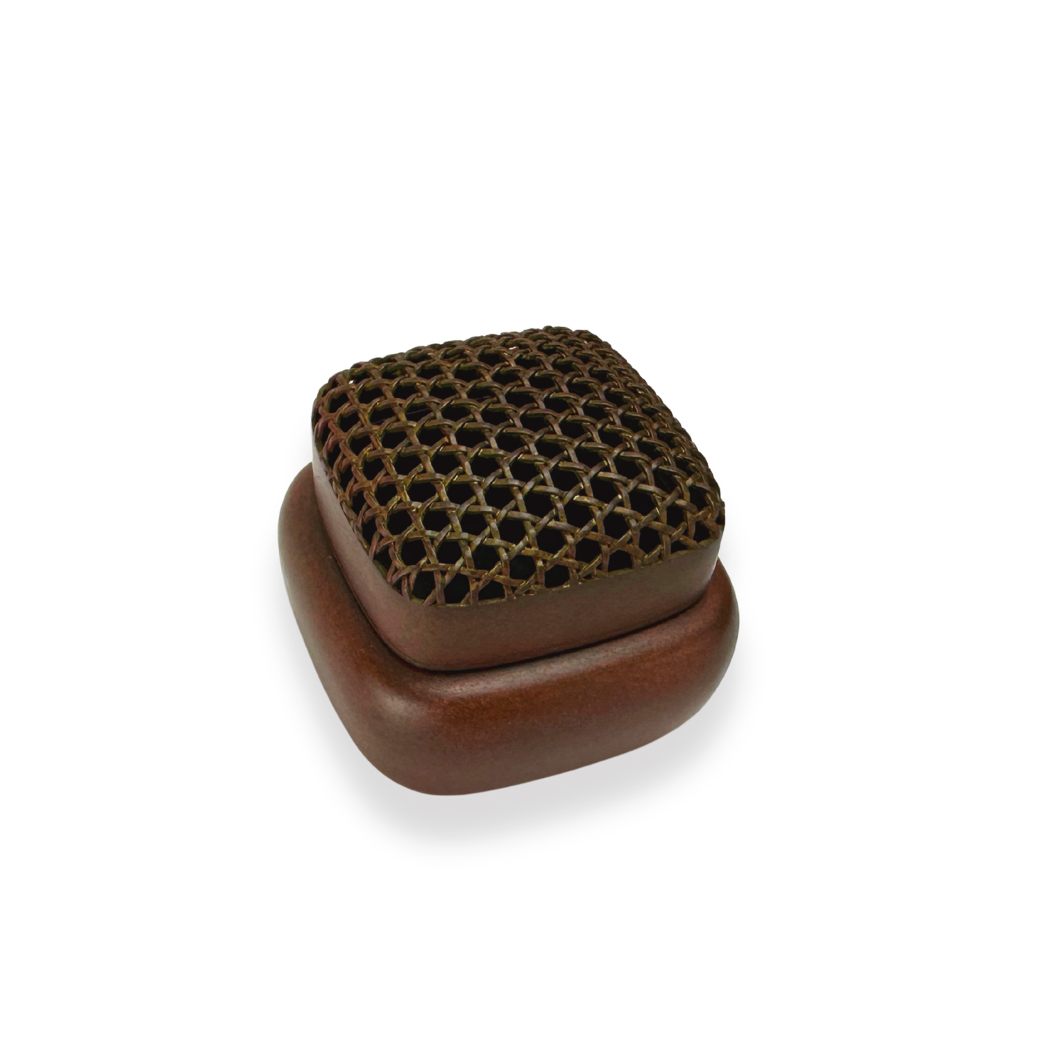 由中國銅爐匠人 陳巧生 手工鑄造,小方手爐造型圓潤輕巧,搭配銅製編網蓋。表面仿古與作銹工藝細膩自然,皮革色調偏紅,溫潤雅致;日用養成後更顯亮澤。