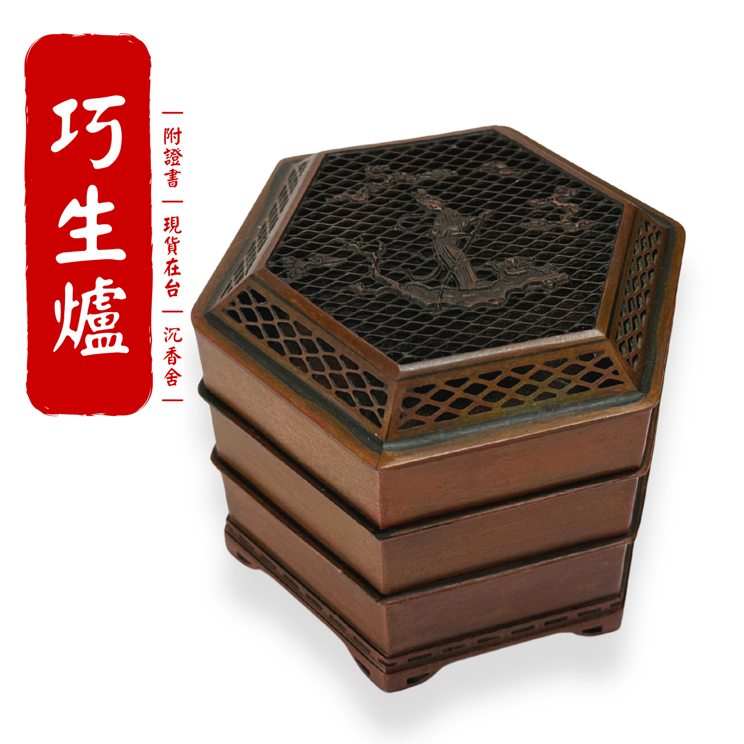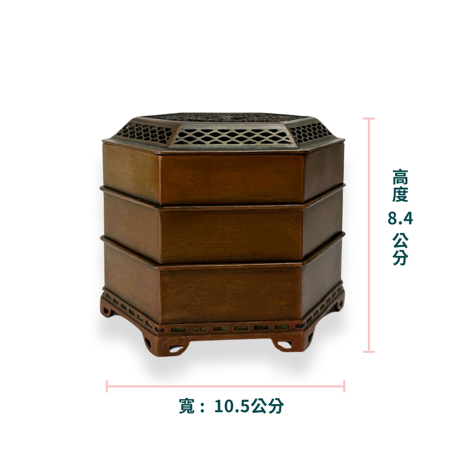 以香粉拓印成形,圖紋立體而不飛灰;六角身段與鏤空蓋面在光影下更顯層次。置於書房、茶席或佛堂,既能穩定薰香,也能傳遞「福壽臨門」的吉意,日用收藏兩相宜。三層用途: 最下層為收納工具區、中層可存放備用香粉、上層為操作篆香區。