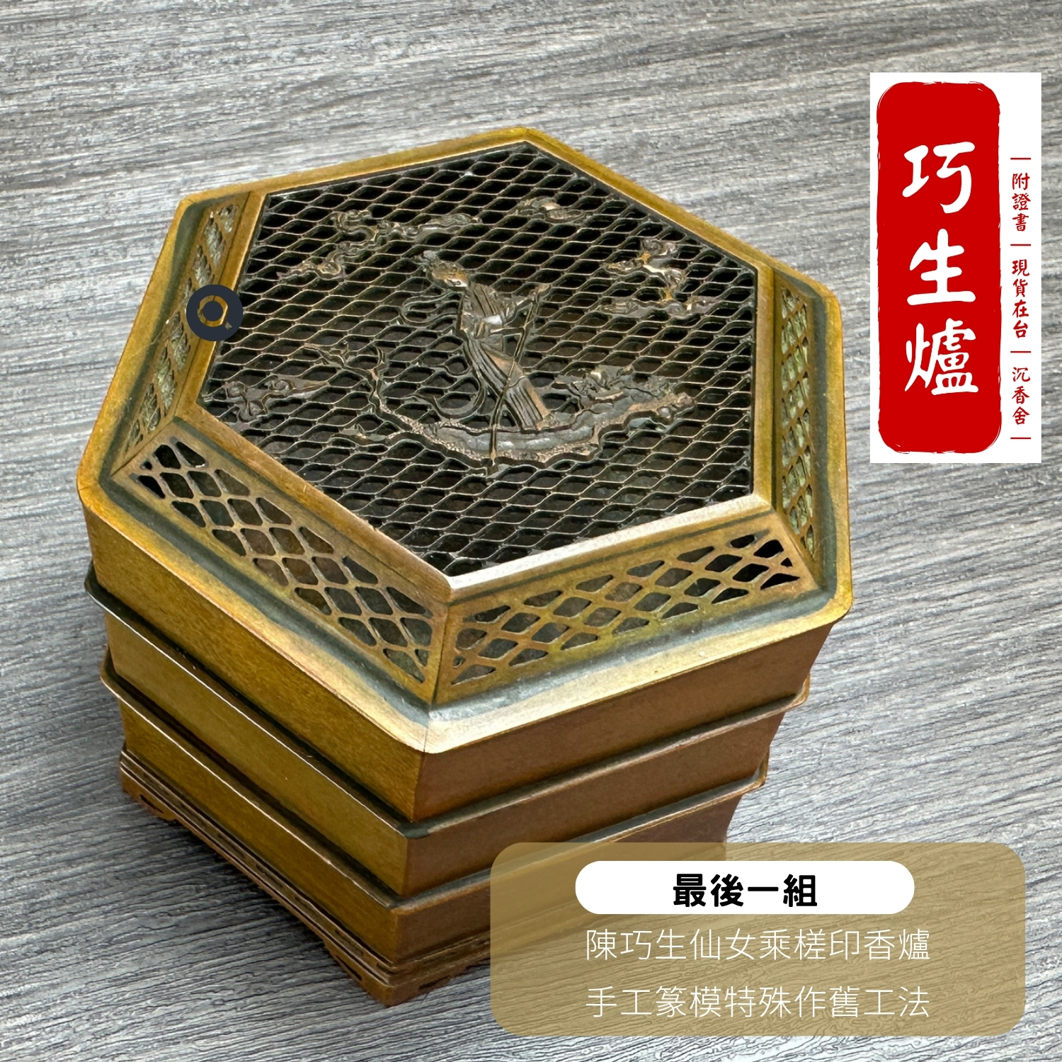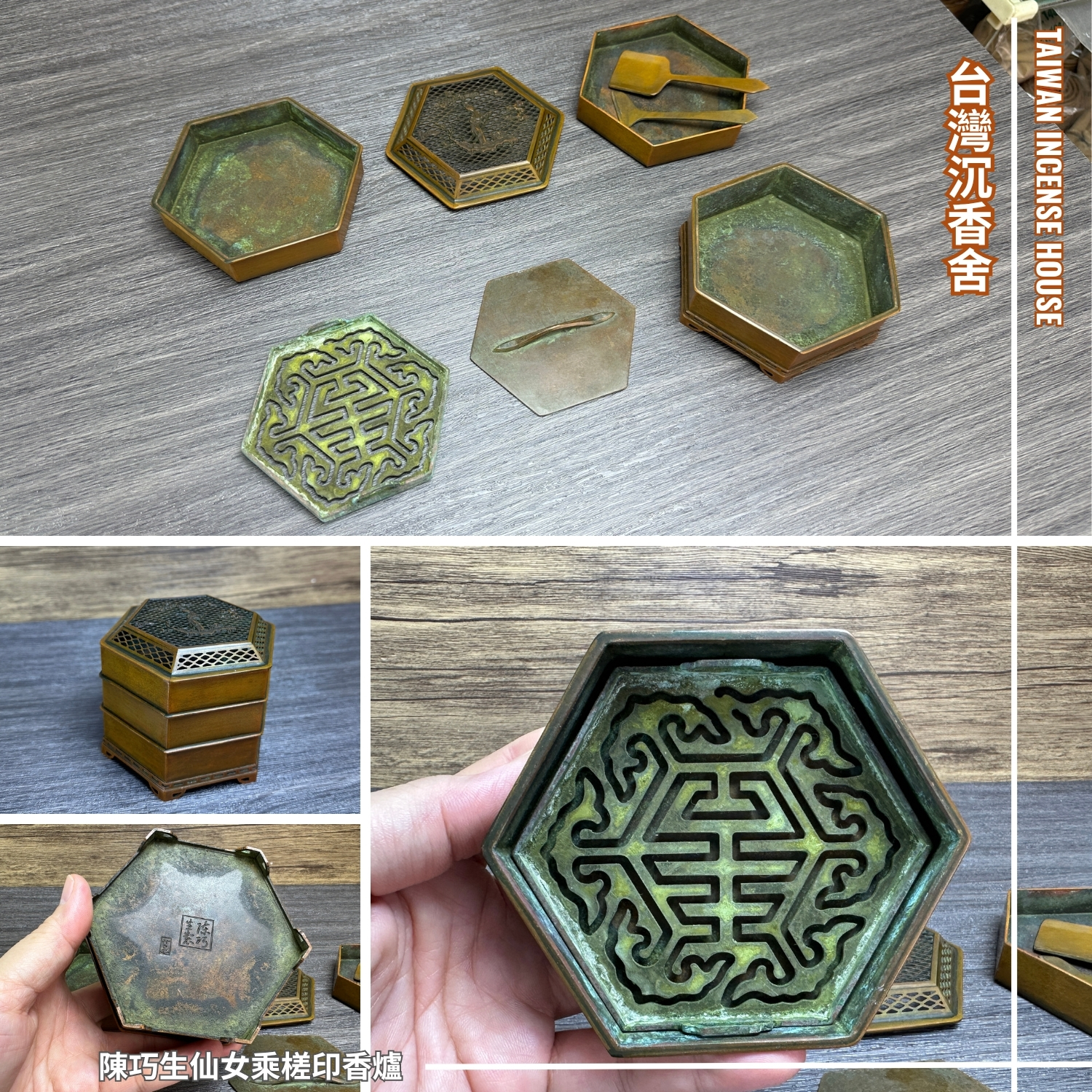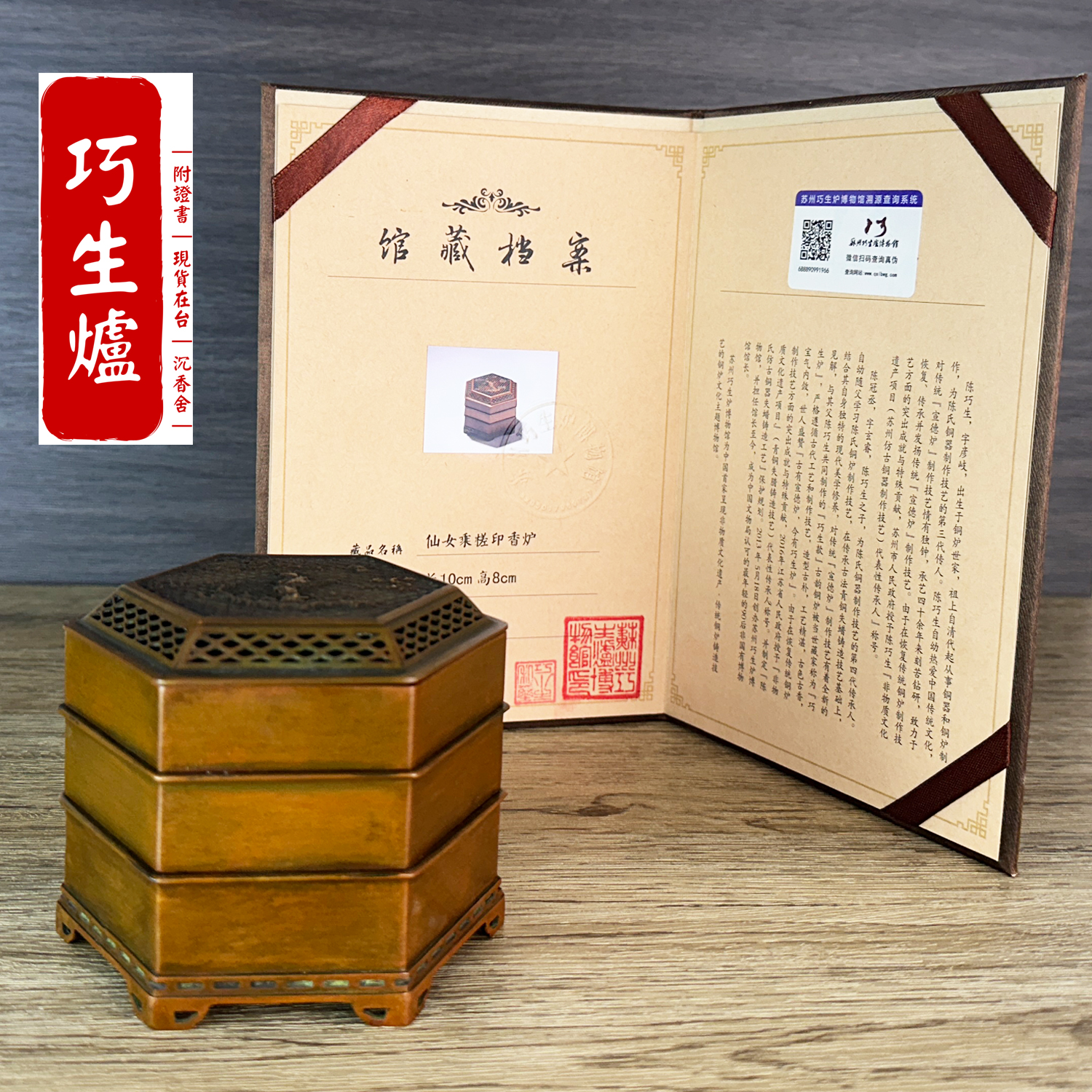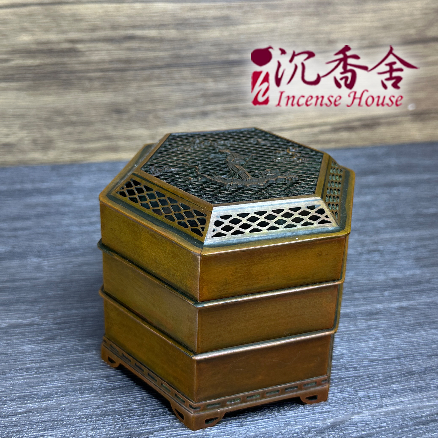 由中國銅爐匠人 陳巧生 手工製作,六角層疊器形穩重端雅。表面採「皮革作舊」工藝,色澤溫潤內斂;內部作銹處理更利於養成包漿。上蓋鏤空浮雕「仙女乘槎」寓意清雅出塵,整體兼具觀賞與實用。