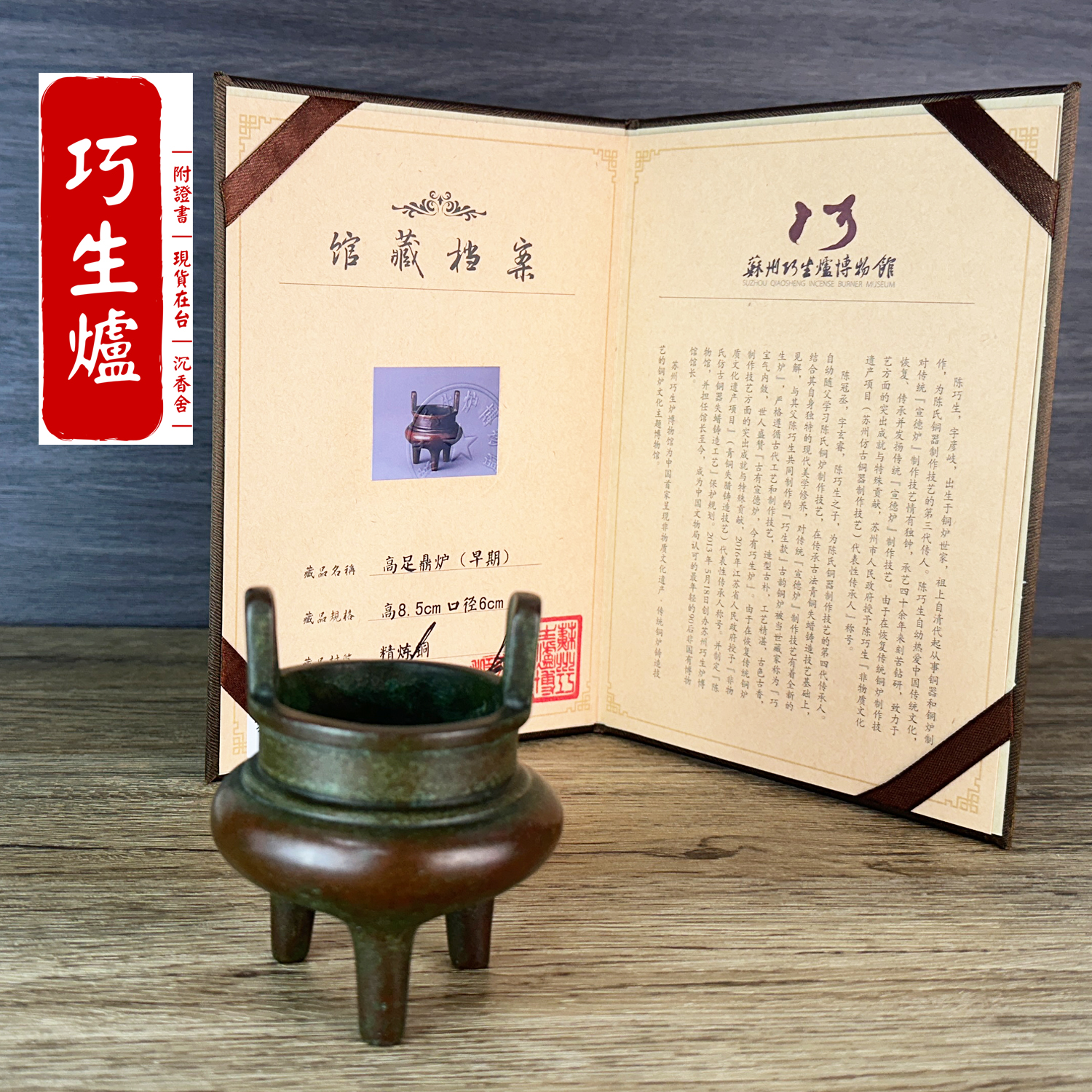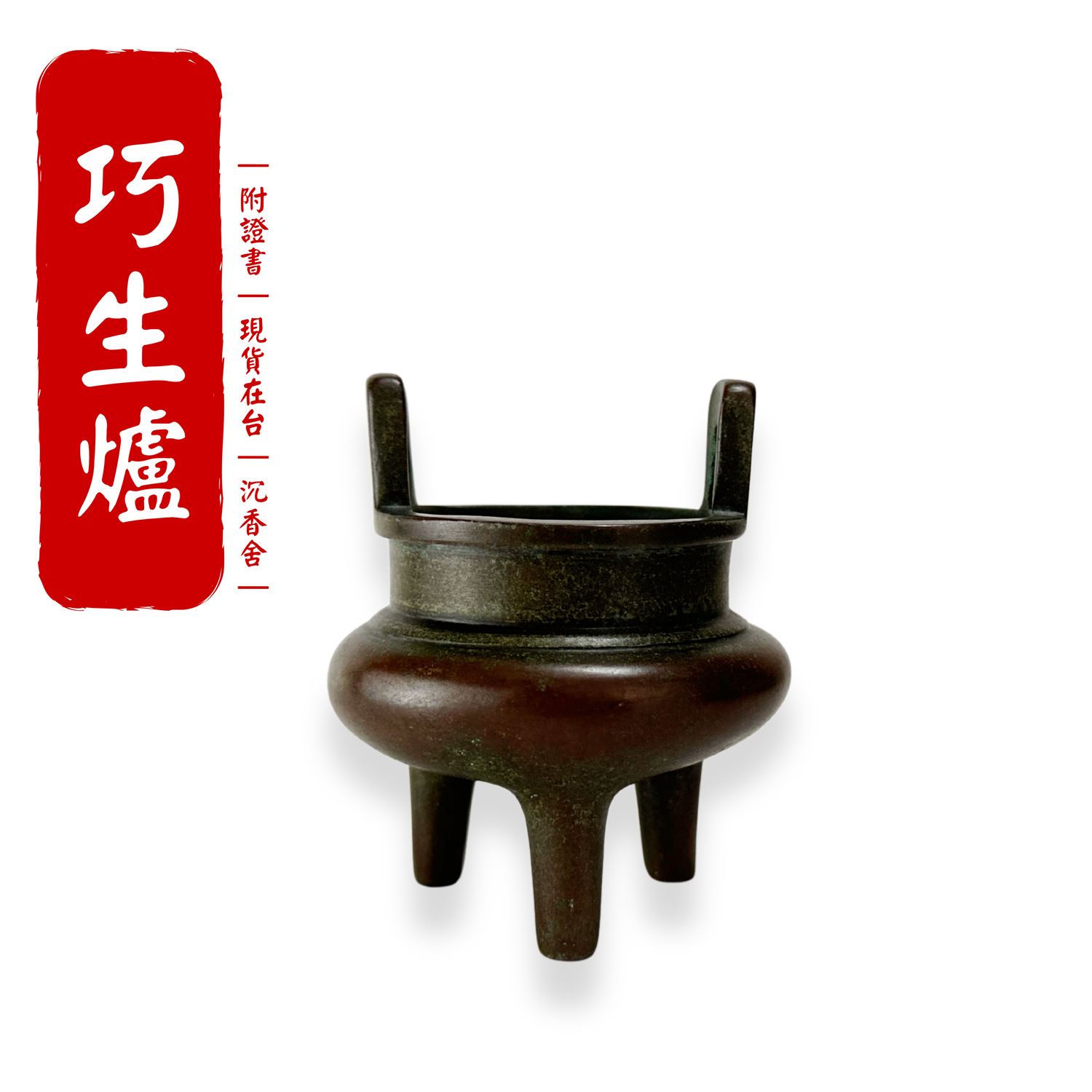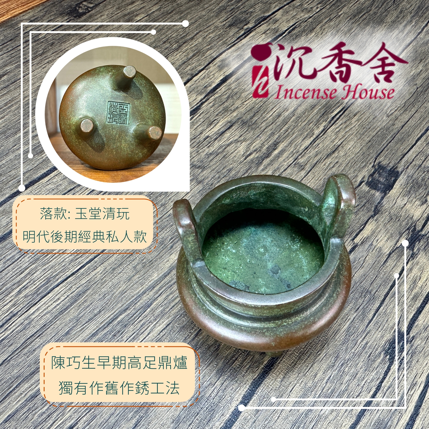 由中國銅爐匠人 陳巧生 手工鑄造的早期作品,承古制鼎形而作,高足三柱挺拔,器形小巧而有份量。早期採用的作舊、作銹工法,皮殼褐綠交融、層次細膩;隨日用養成更顯圓潤光澤。落款為 「玉堂清玩」,明代後期經典私人爐款,文房氣息濃厚。早期爐,只有一個。