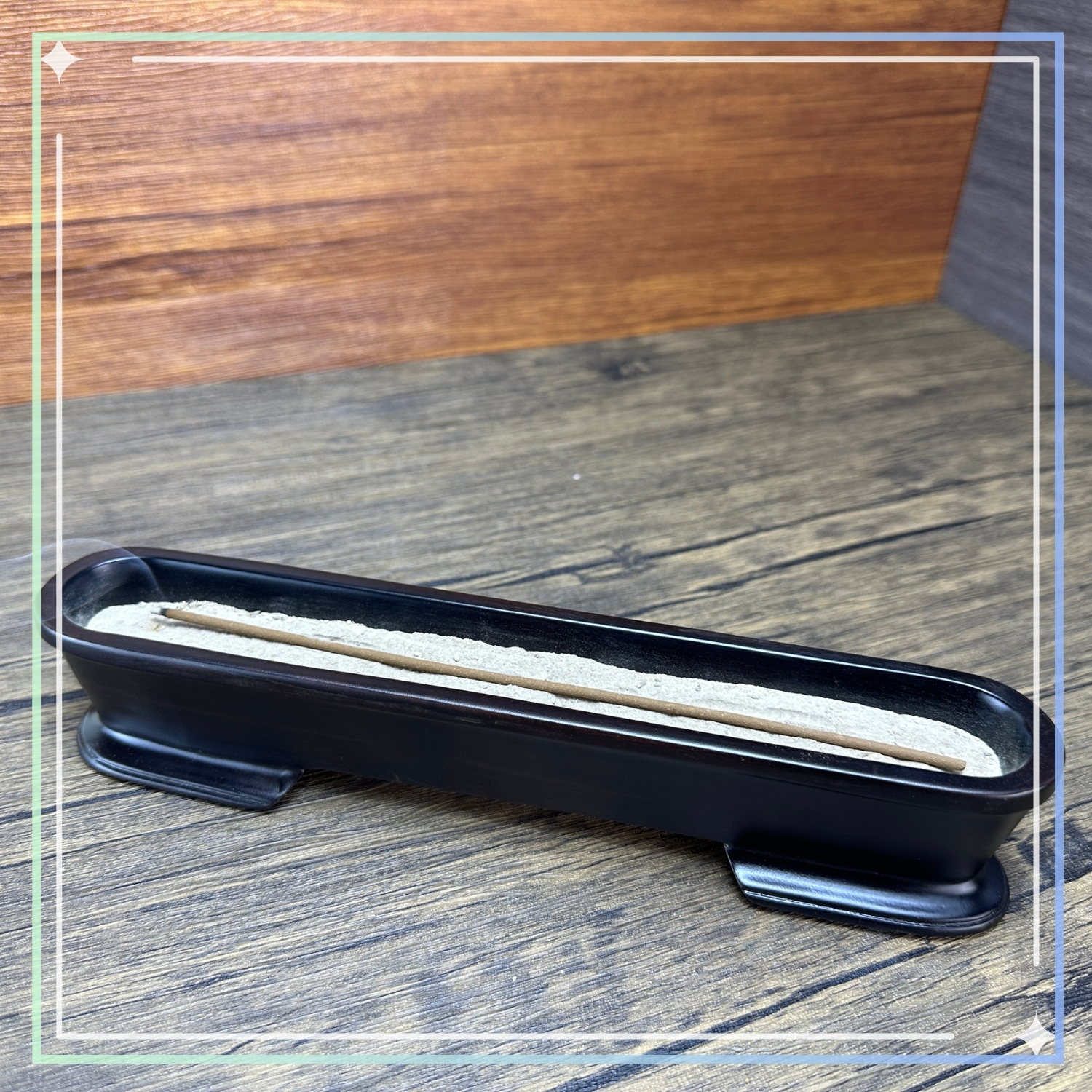 - 使用方式:先舖置香底灰(建議厚度≧ 0.5公分,厚一點更佳),再將點燃的線香平放於其上,可穩定且完整燃燒,香灰集中不外散。